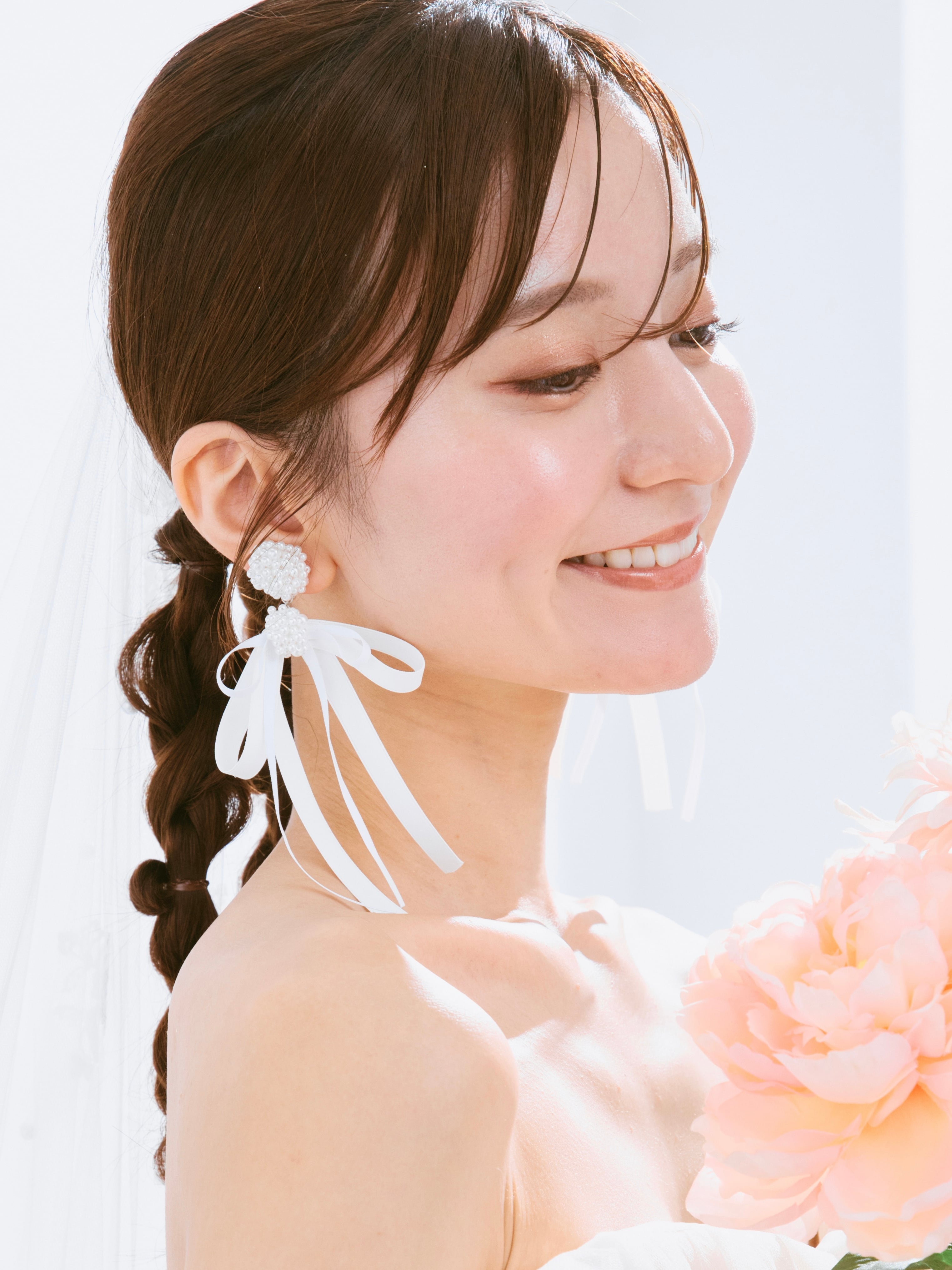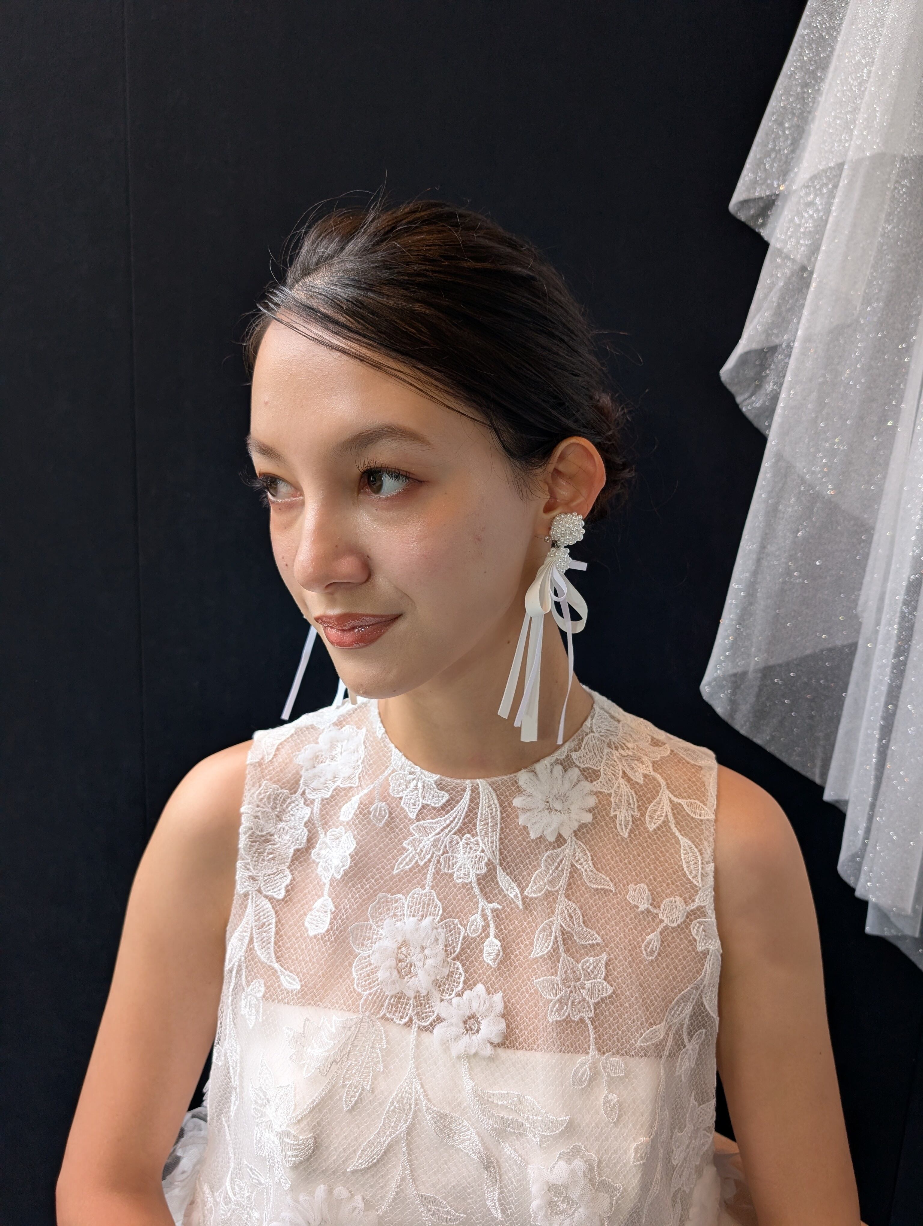 高級感ある両面マットサテンを使用し、イヤリングトップとリボンの結び目に