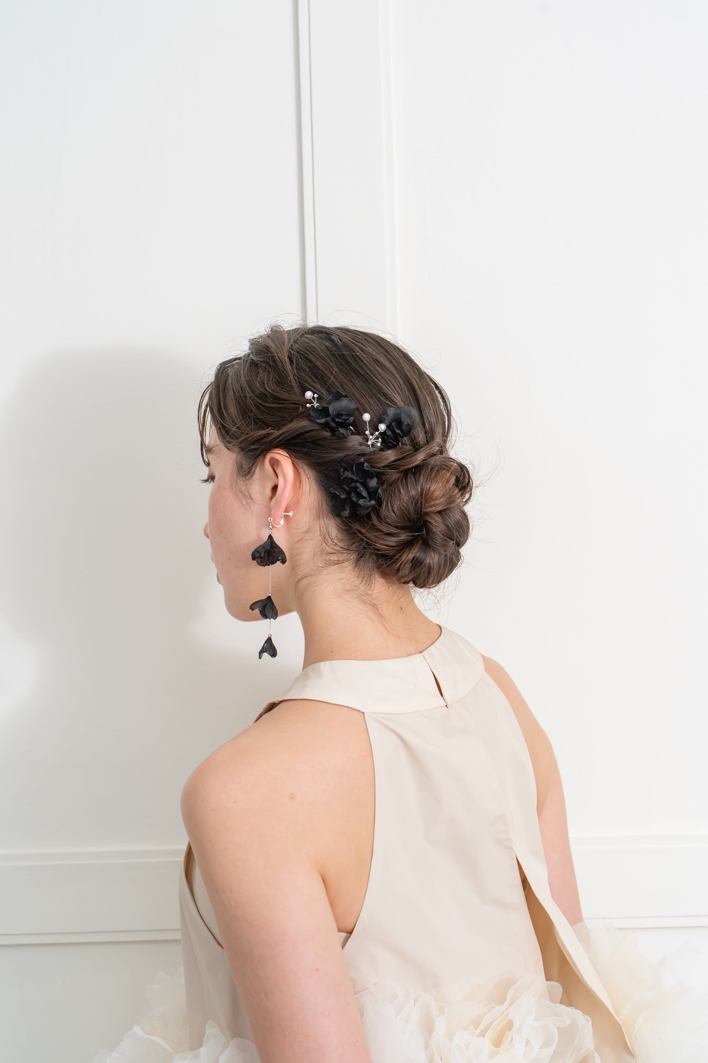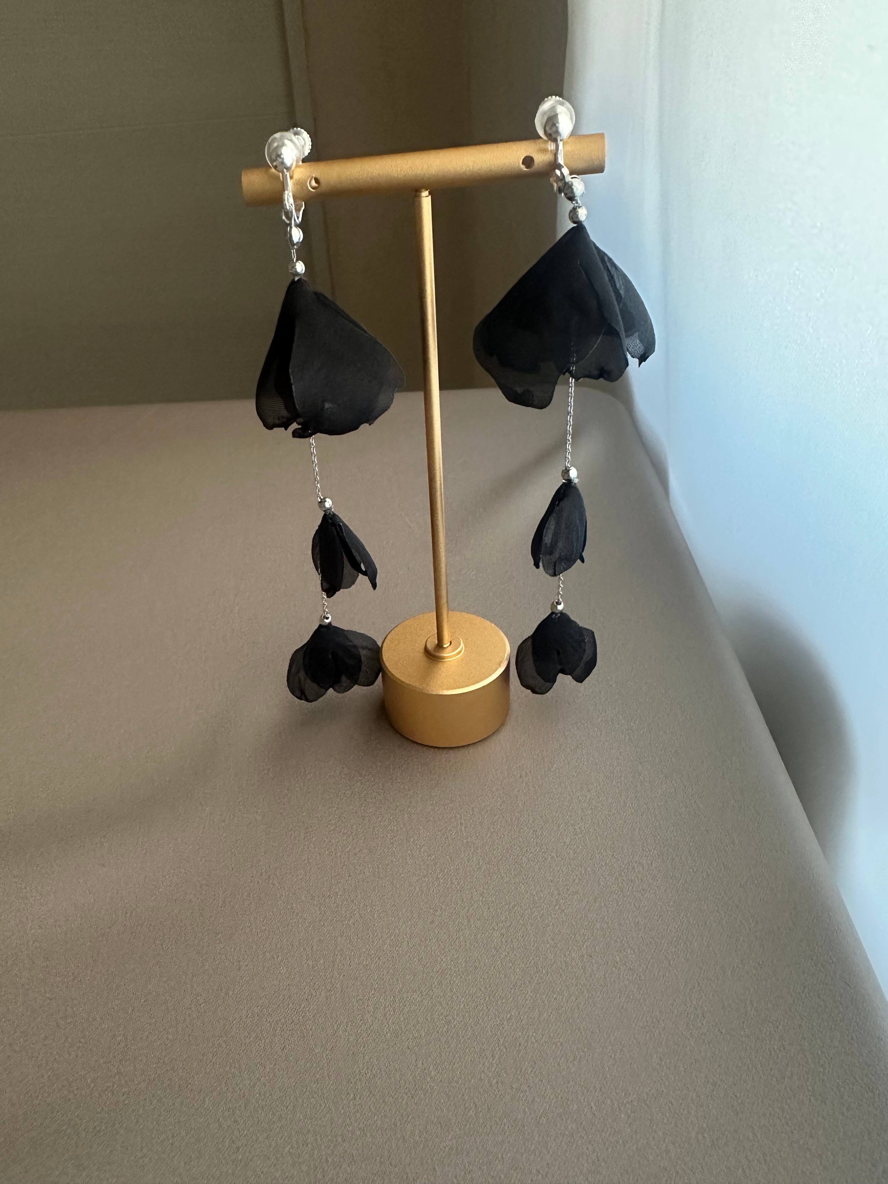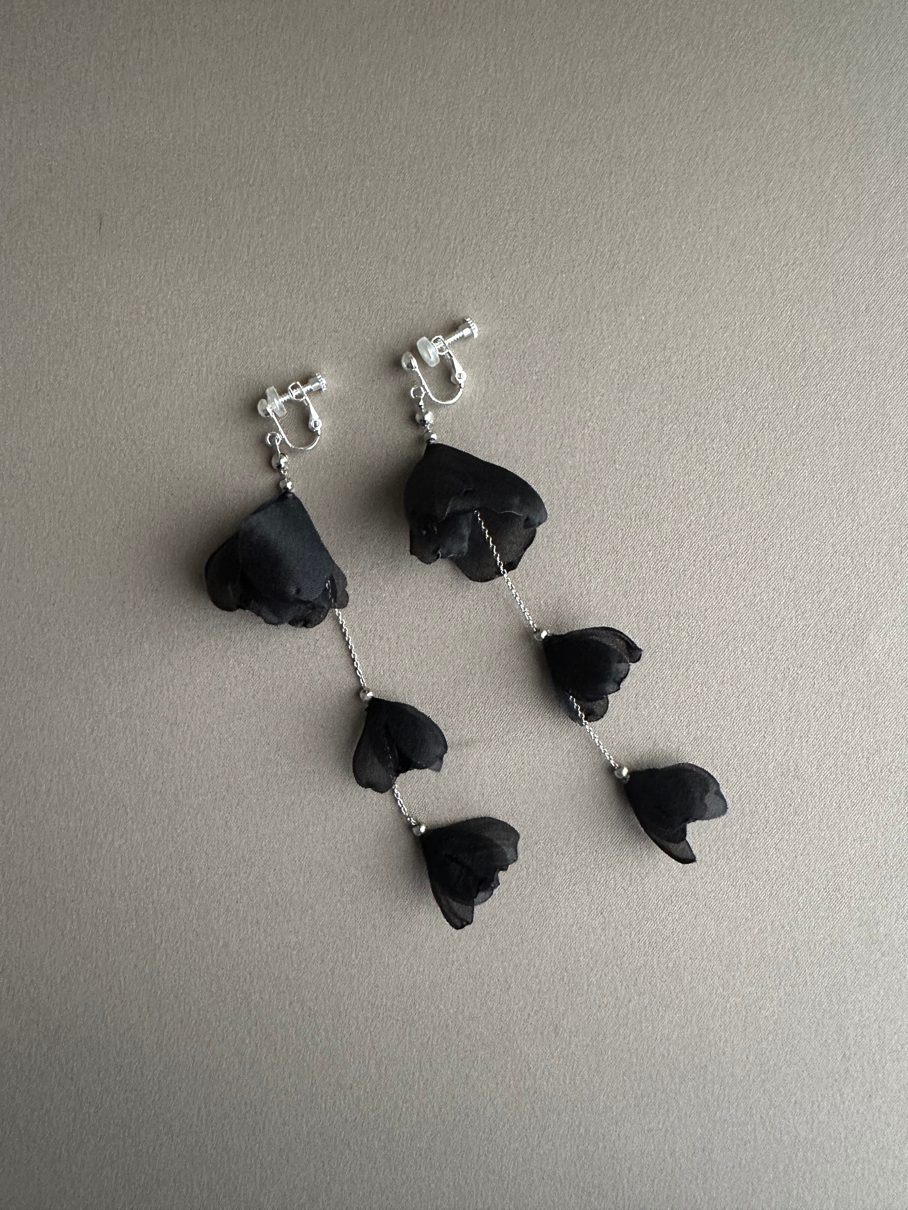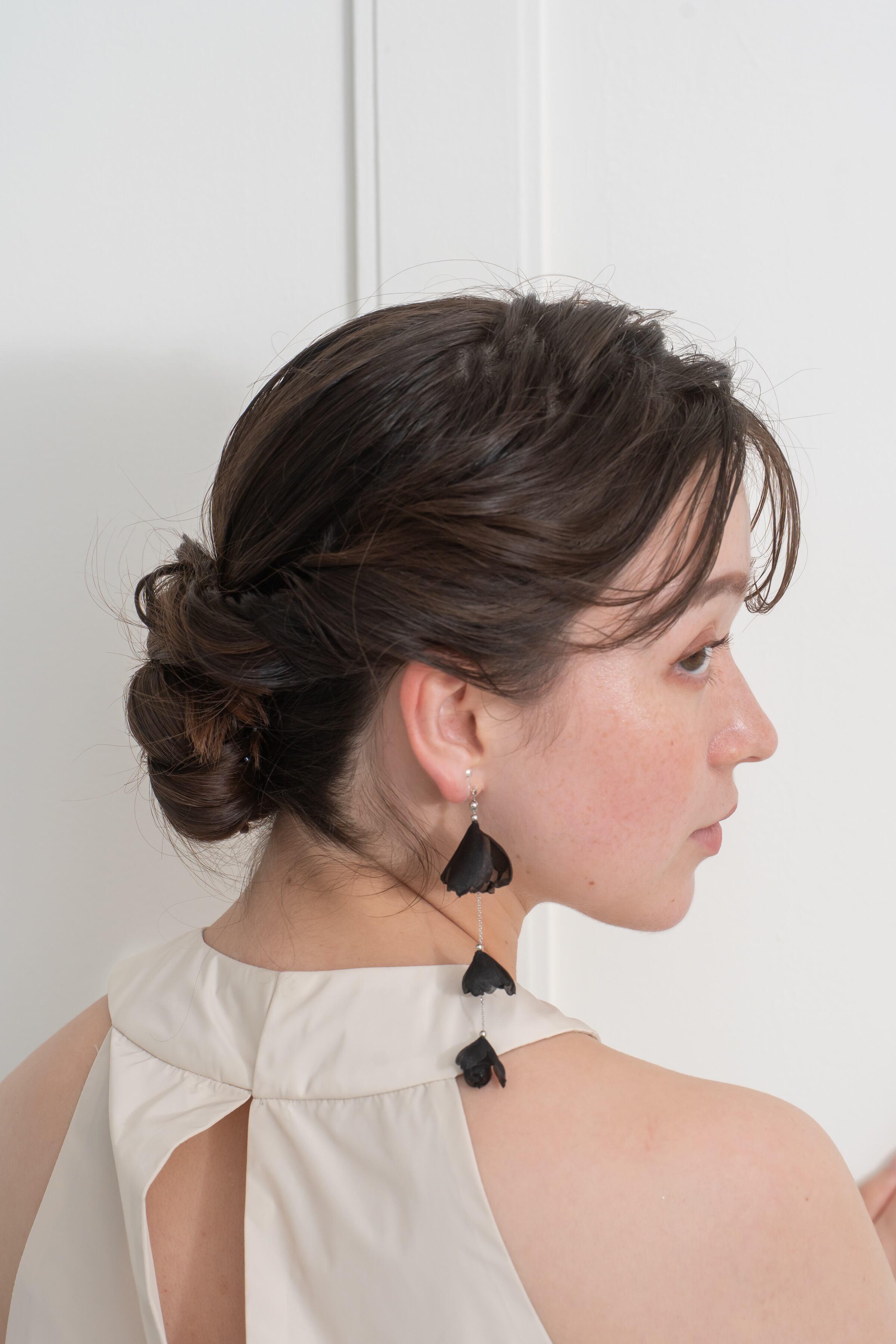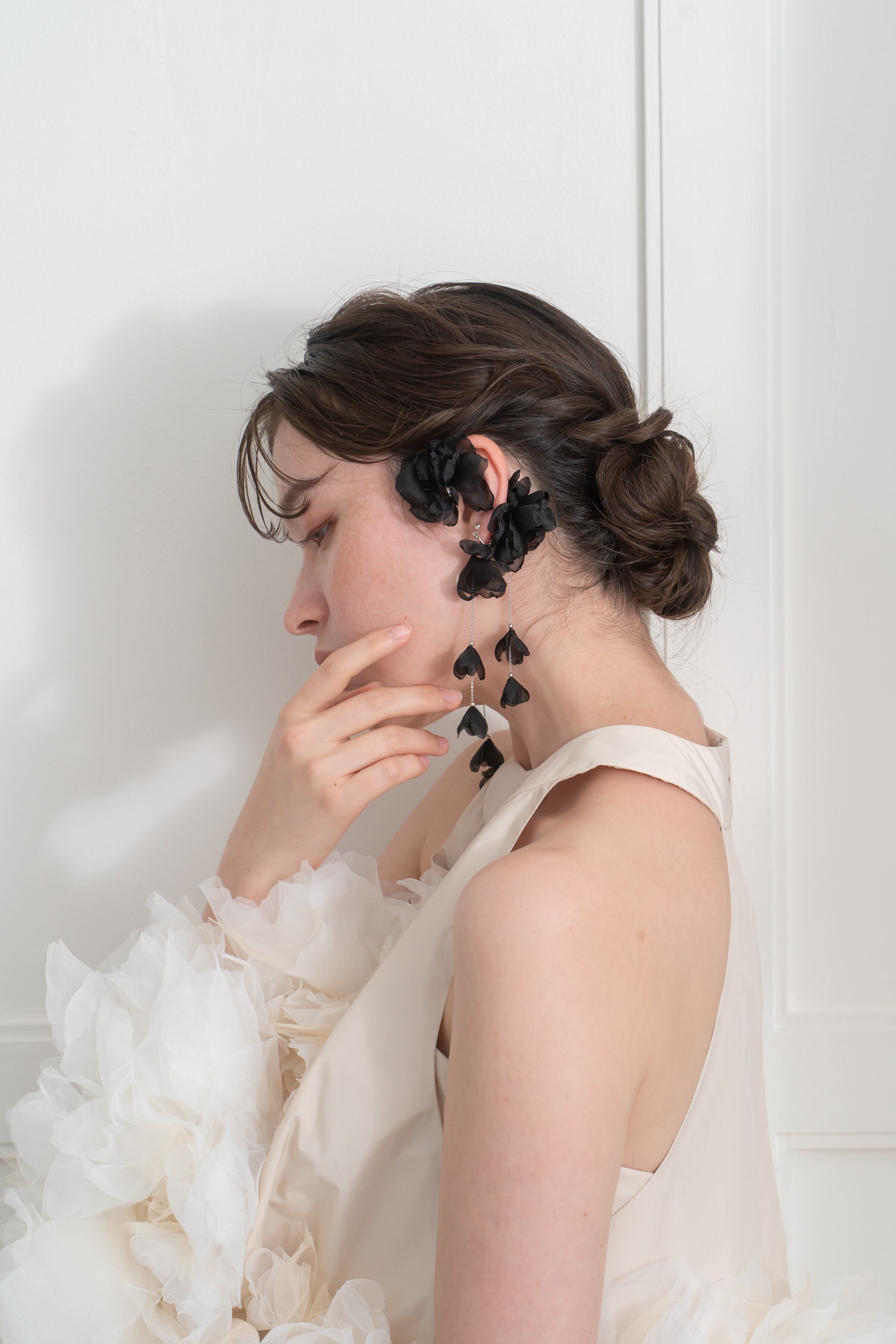 本物のお花をそのまま耳にまとうようなファブリックフラワーモチーフのイヤリング。