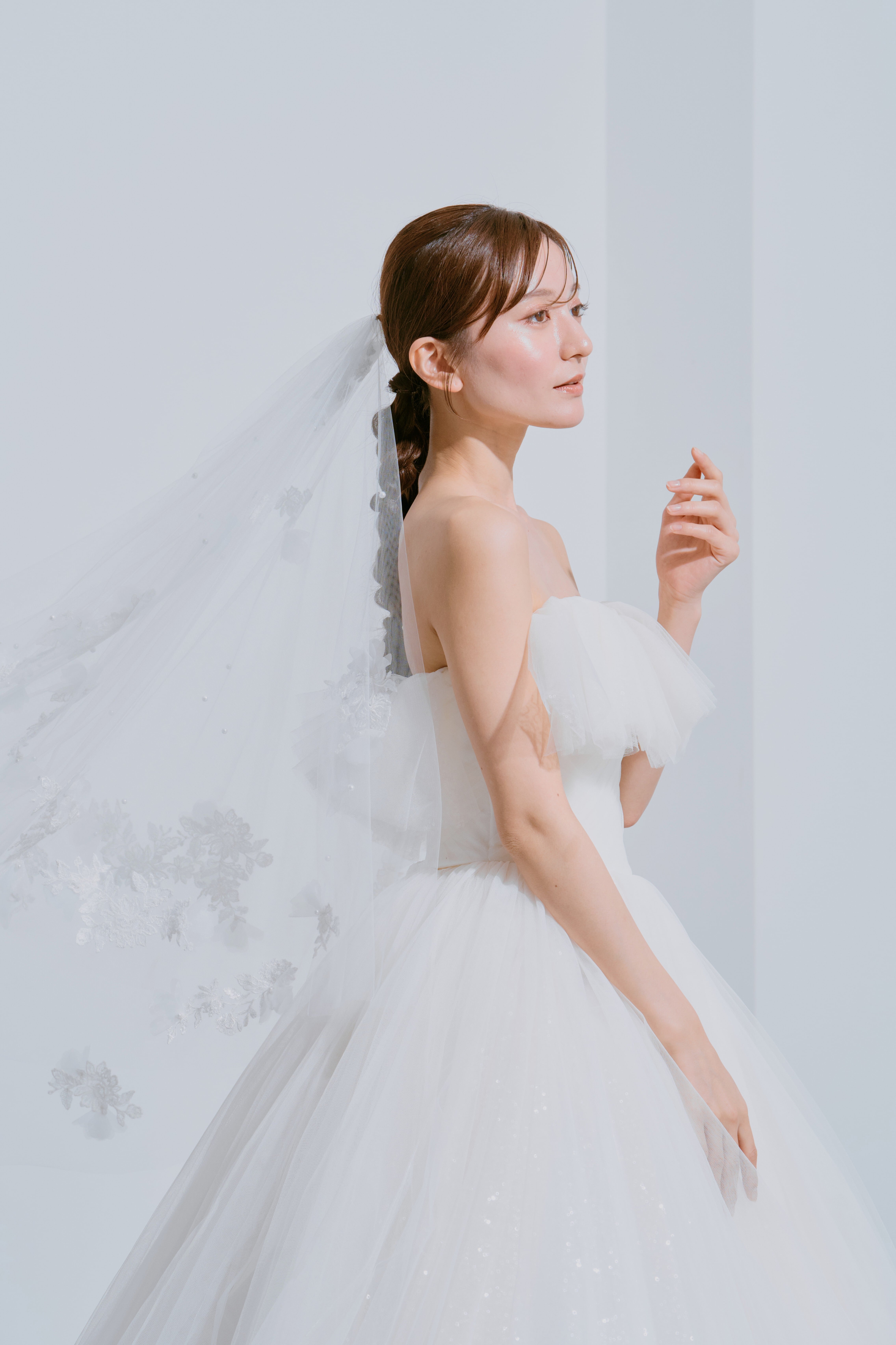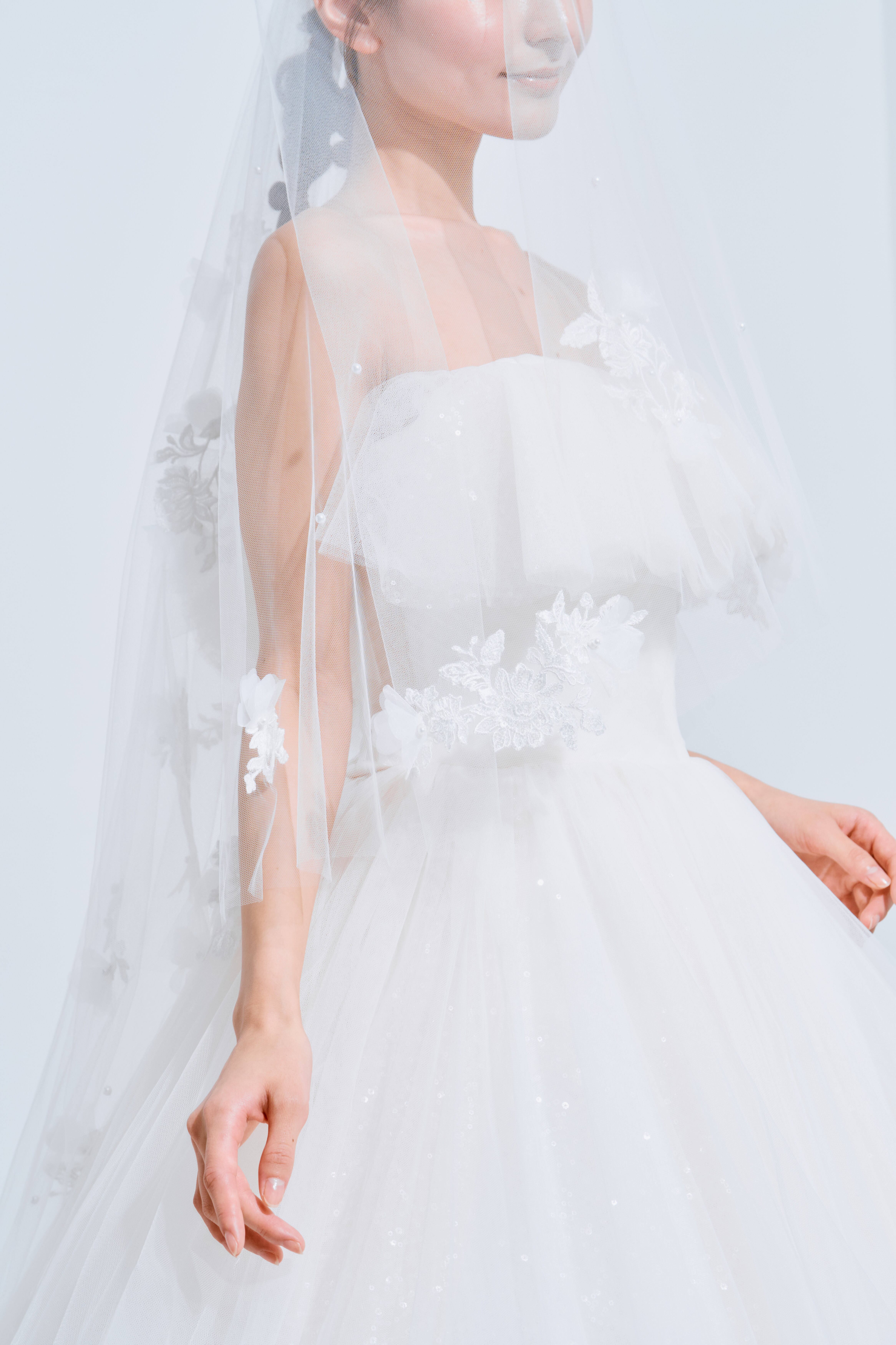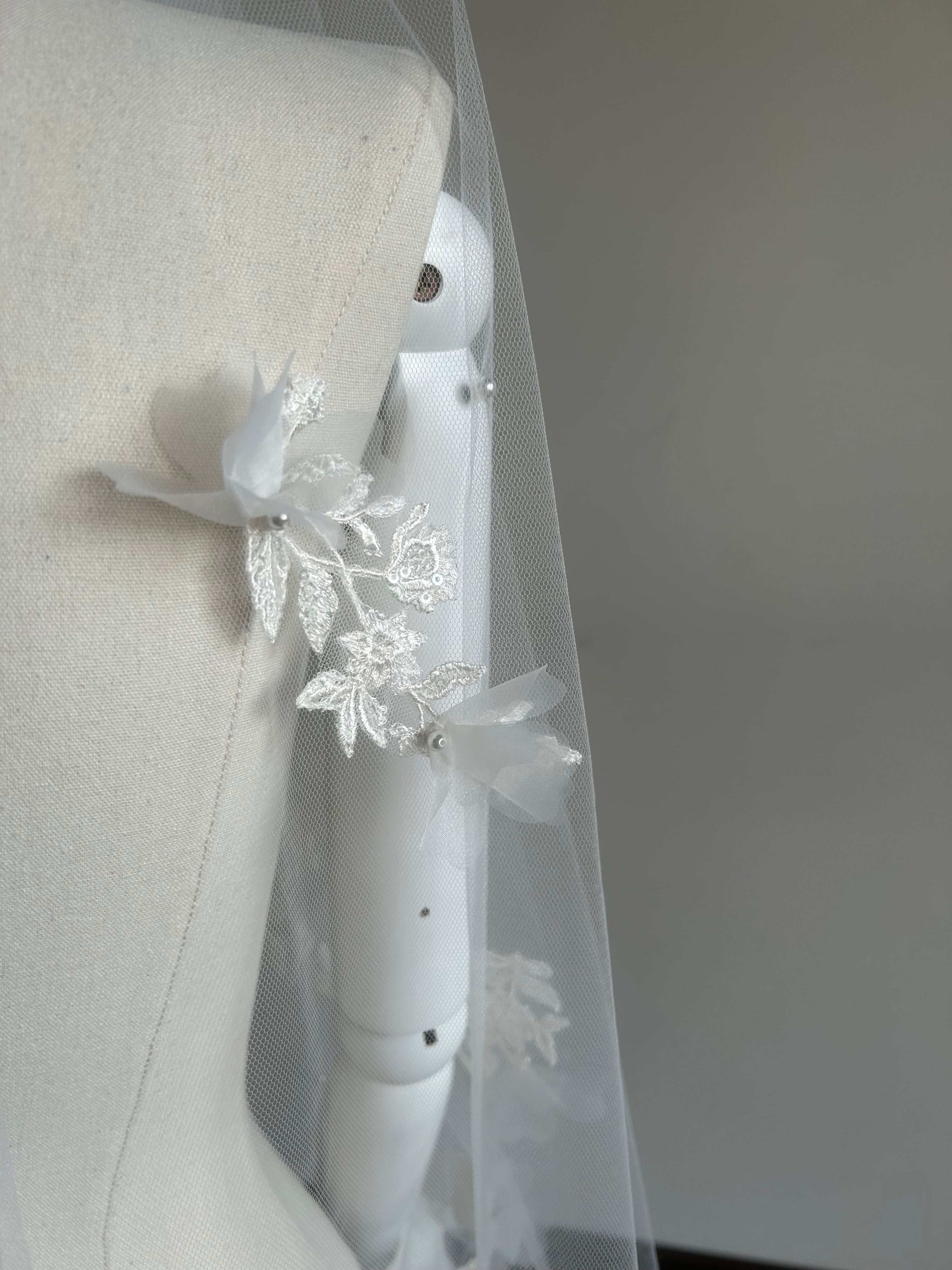 柔らかい風合いのベールチュールに、繊細なボタニカルレースを細かくカットし配置、