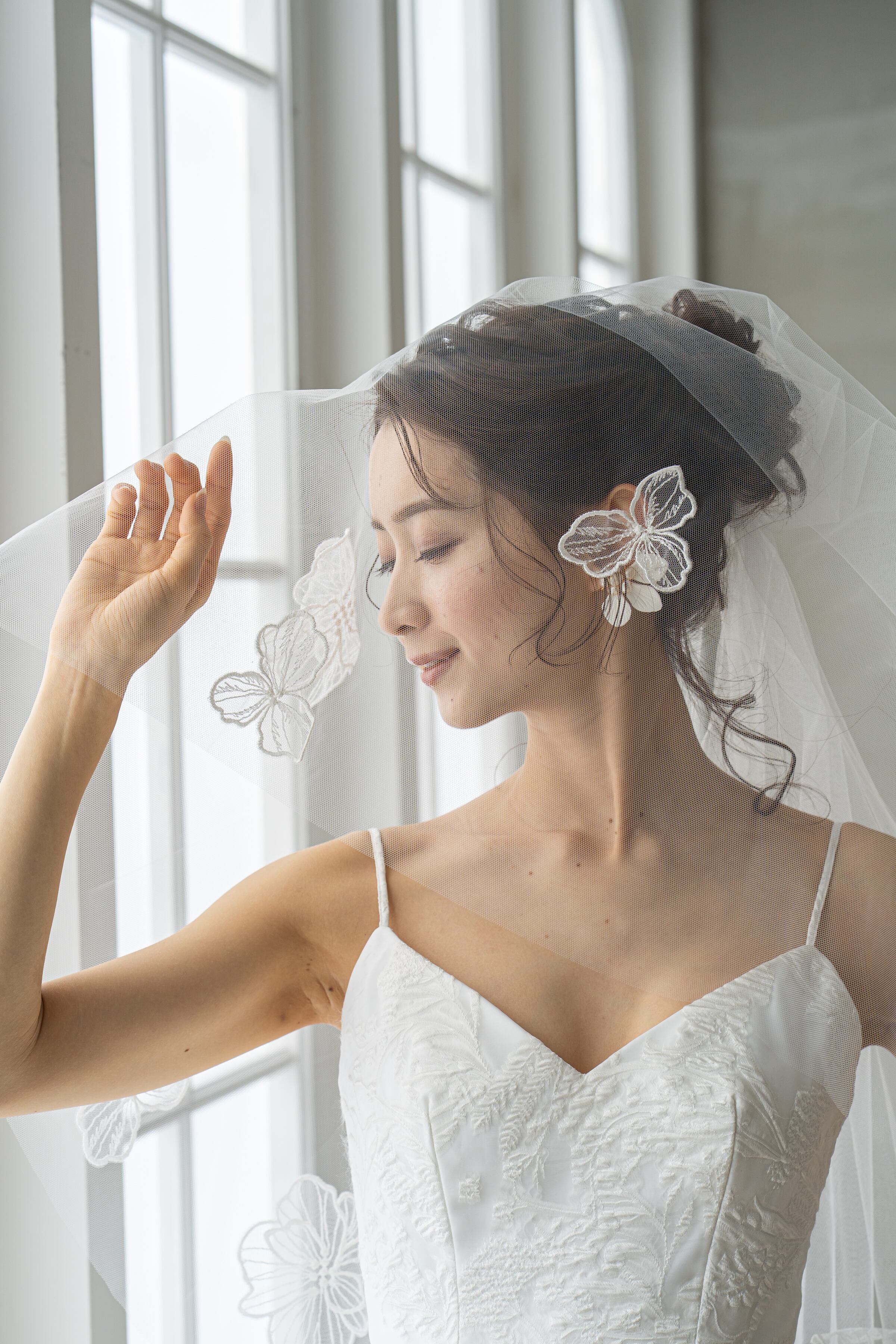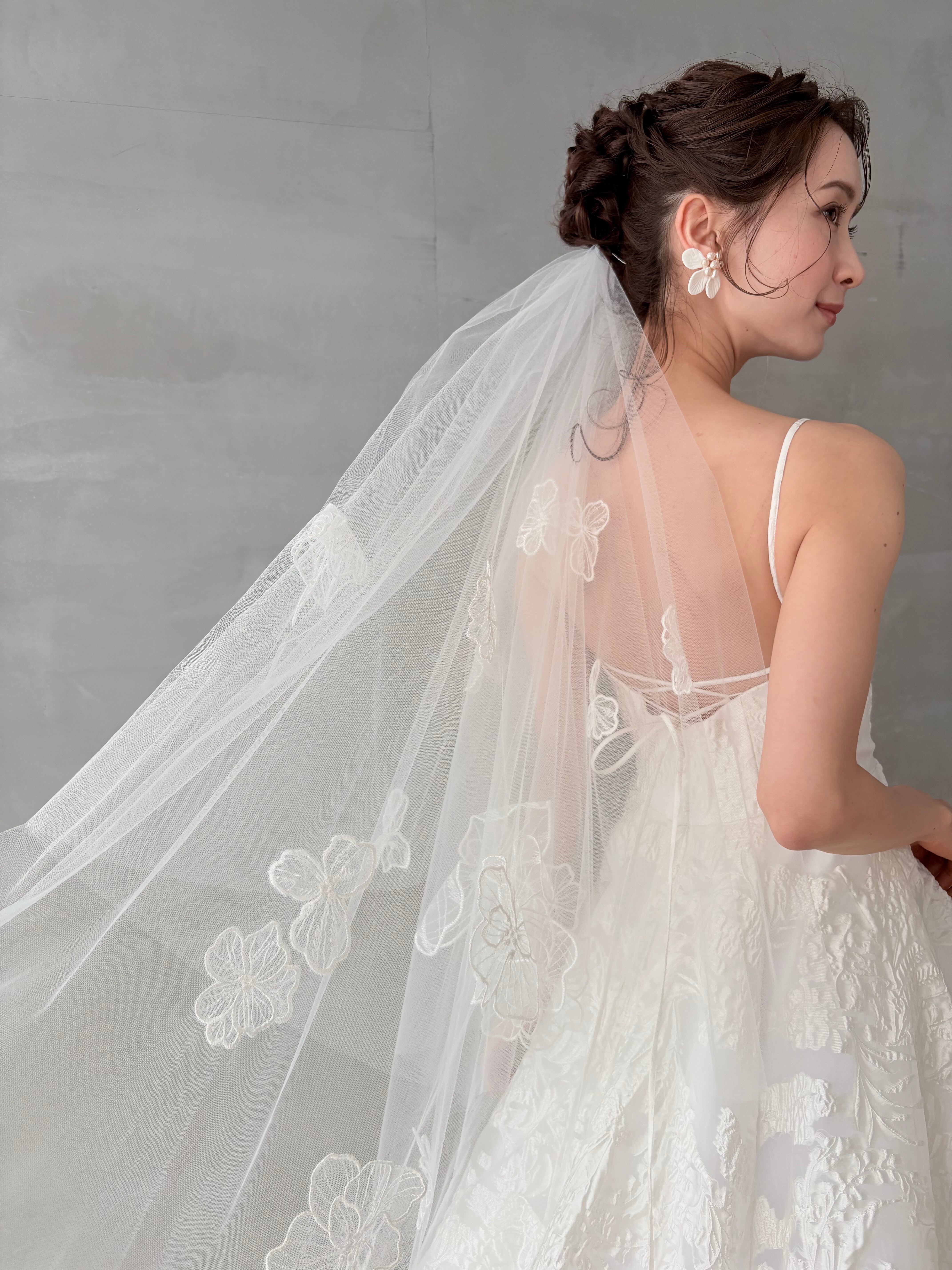 マットな中にも上品な艶を感じさせるトレンドのベールに仕上げました。