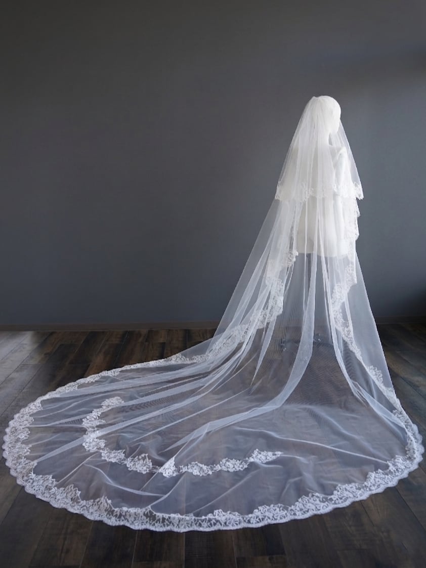 繊細でありながらも重厚感のあるデザインでワンランク上の装いに導くデザインのベール。裾まわりに贅沢にあしらわれたダブルラインのレースが圧倒的な存在感と高級感を演出します。