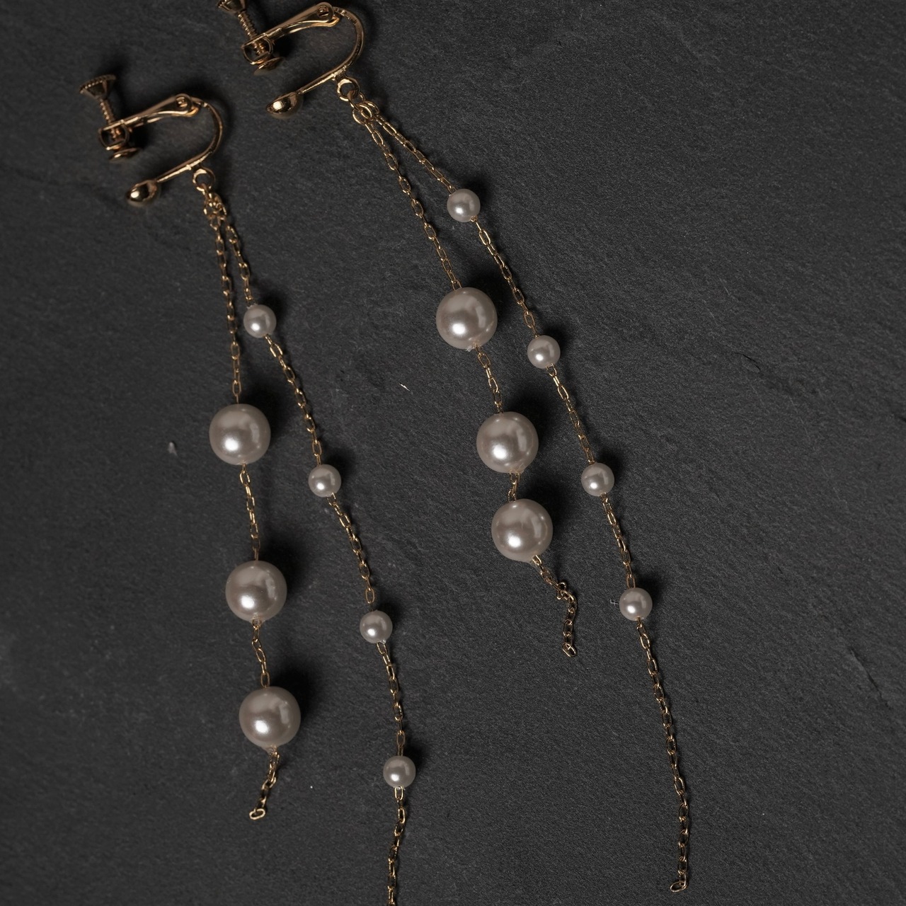 繊細なエレガンスチェーンと艶めく大小のパールを組み合わせたシンプルなデザイン。