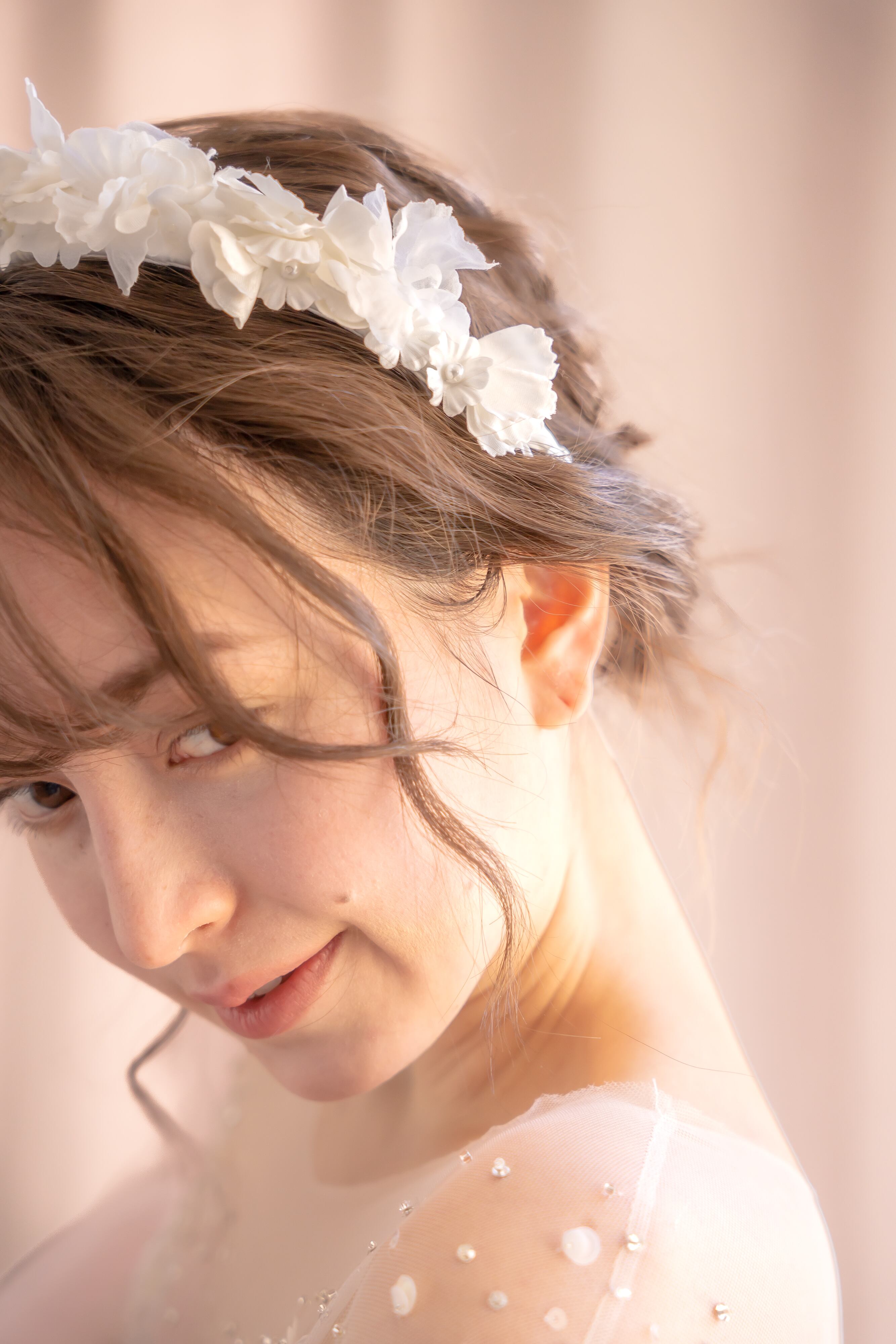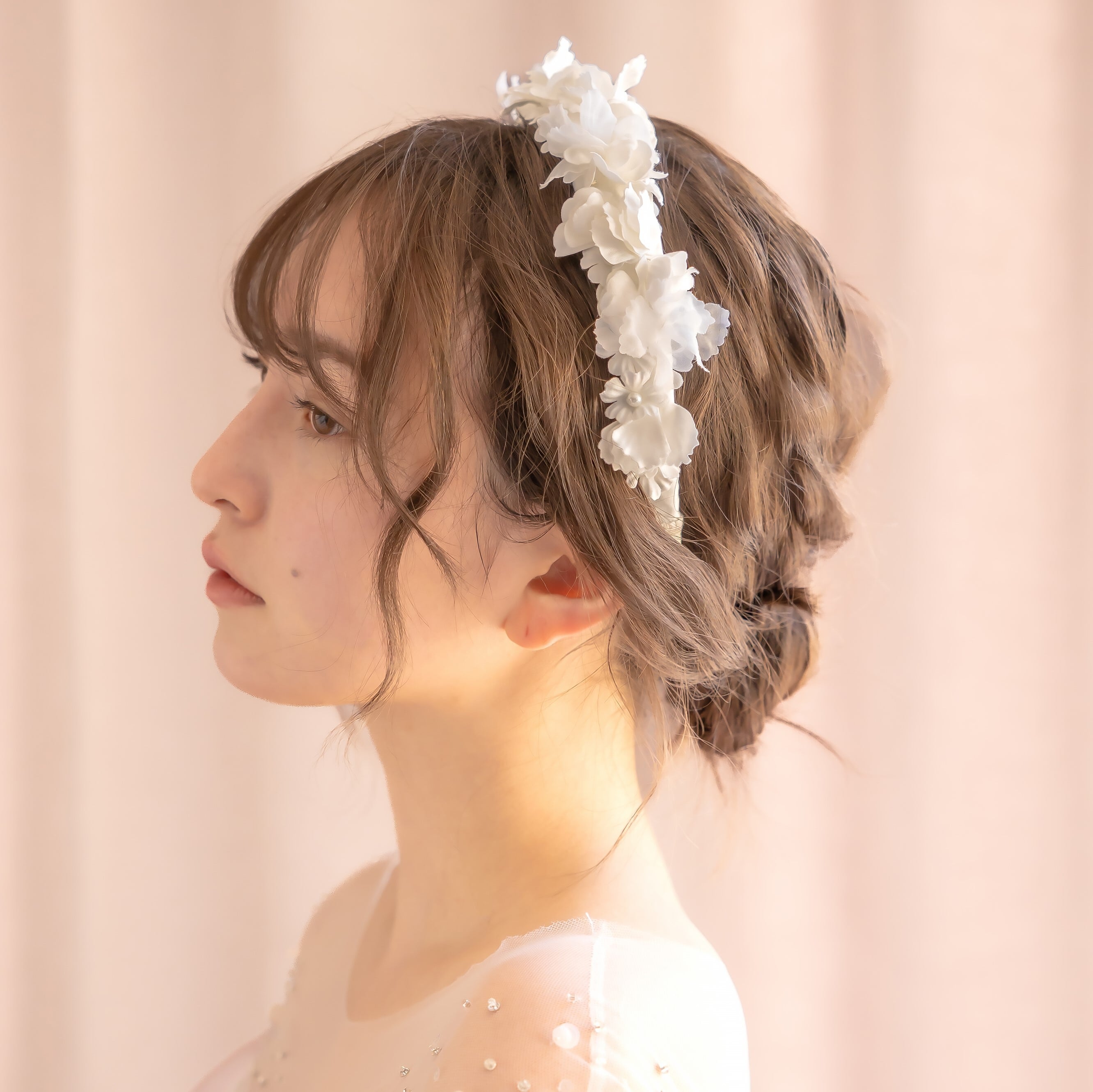 下地にちらっと除く総レースとお花の所々にさりげなく施したビーズ刺繍が繊細な印象を与え、見るものを魅了します。
