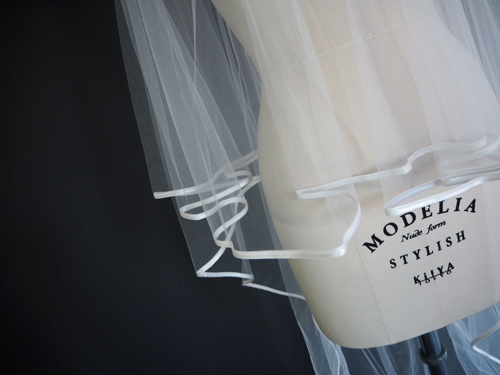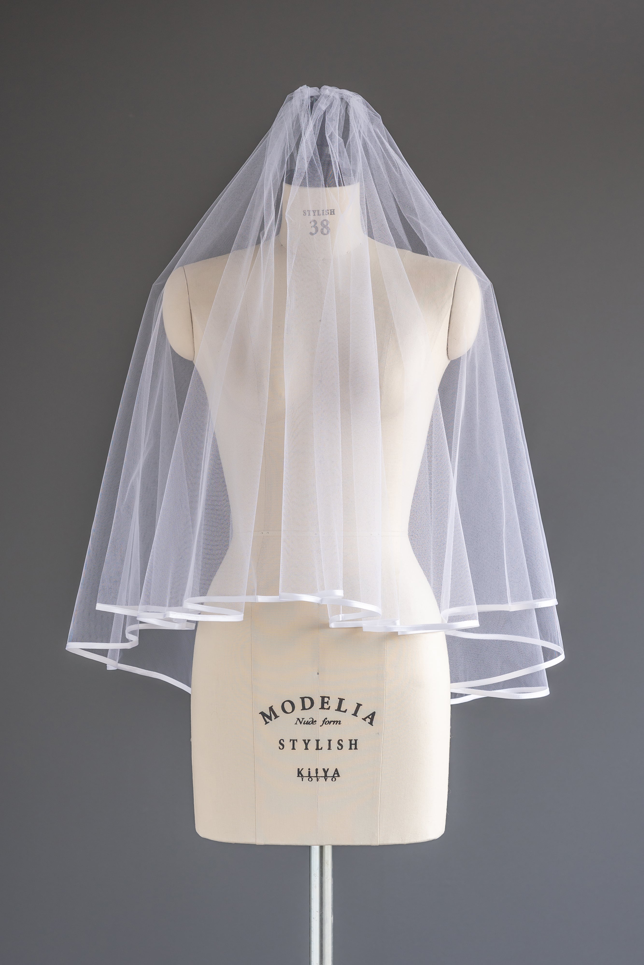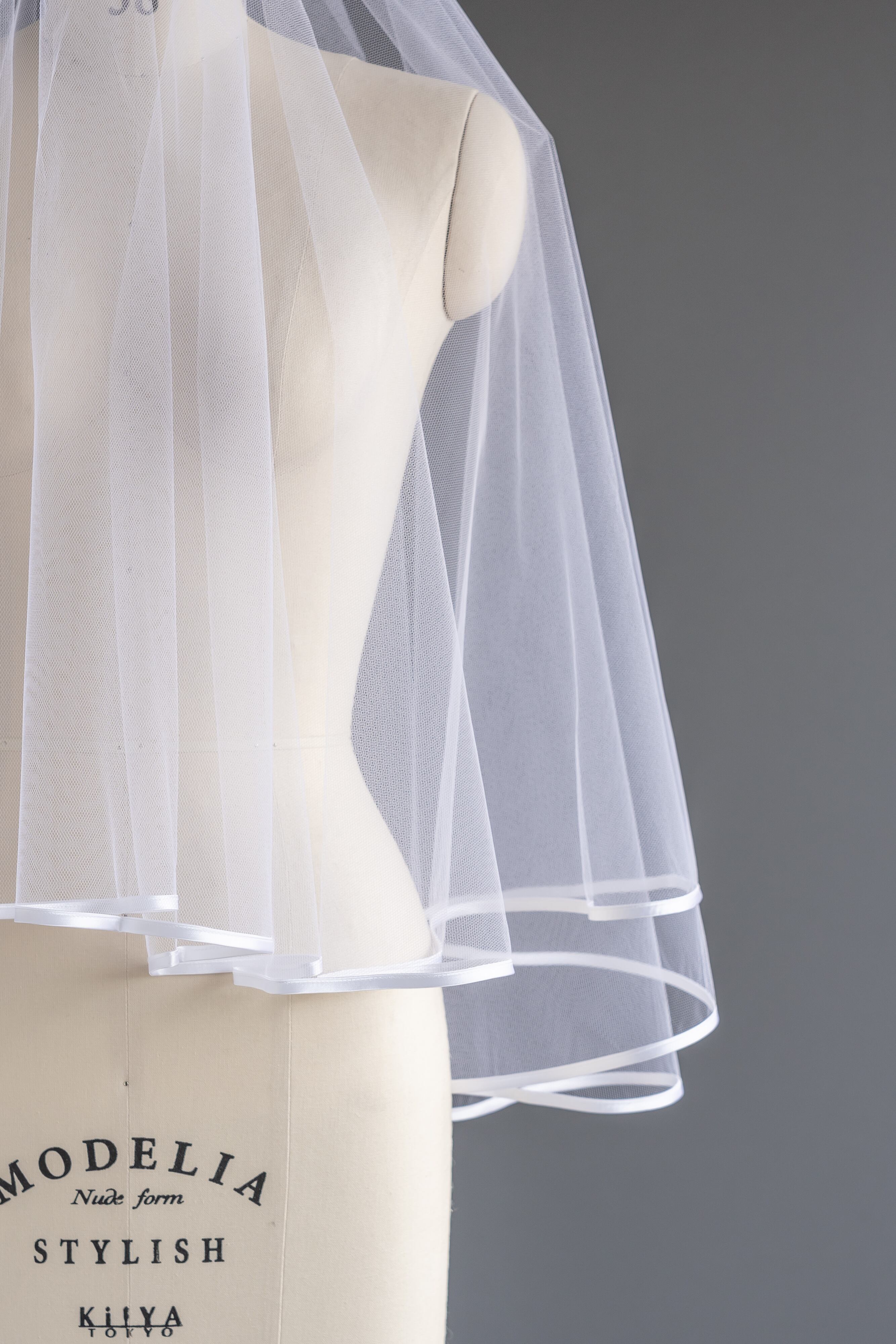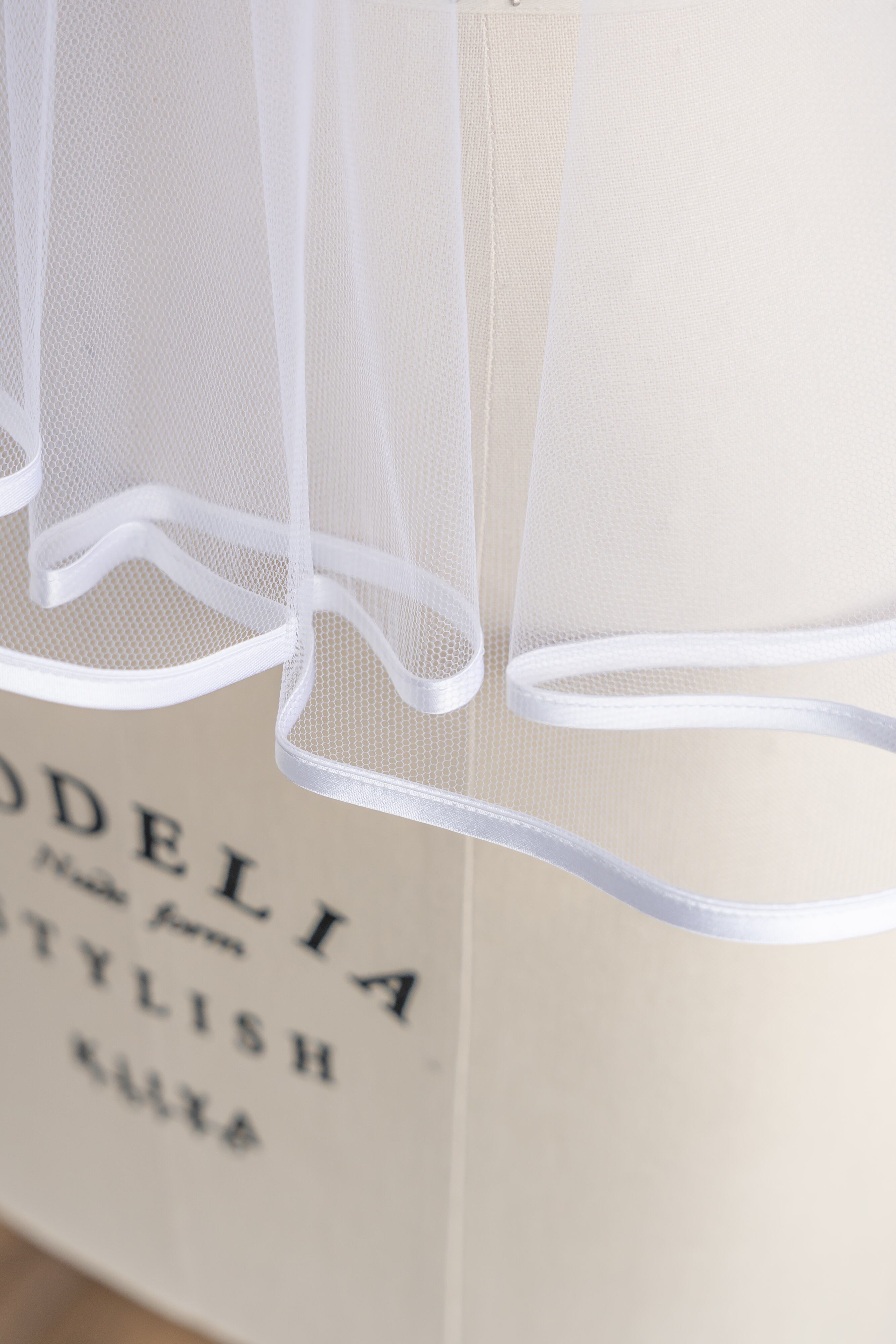 無地ソフトチュールの縁にサテンテープでパイピング加工を施したベール。