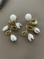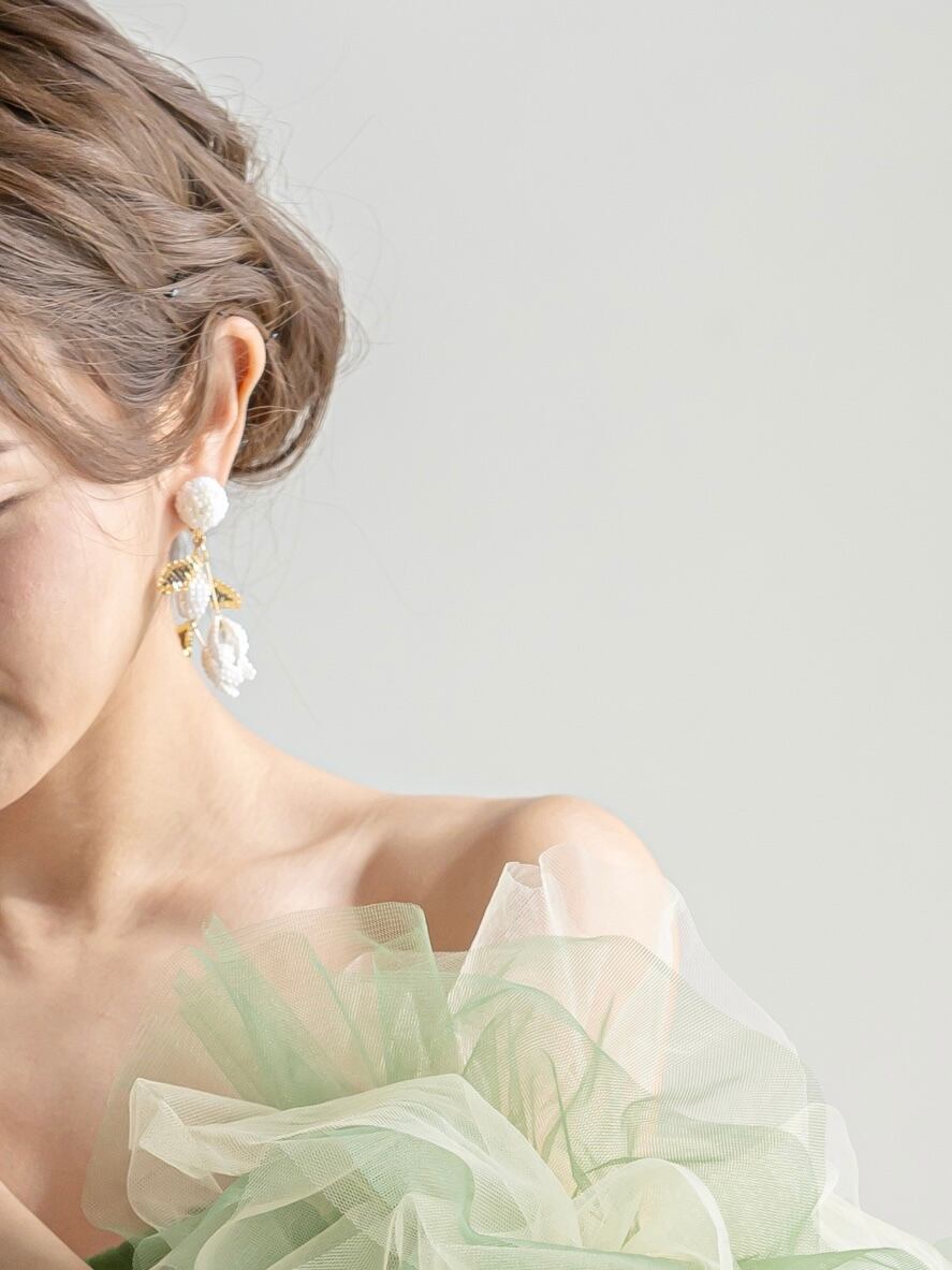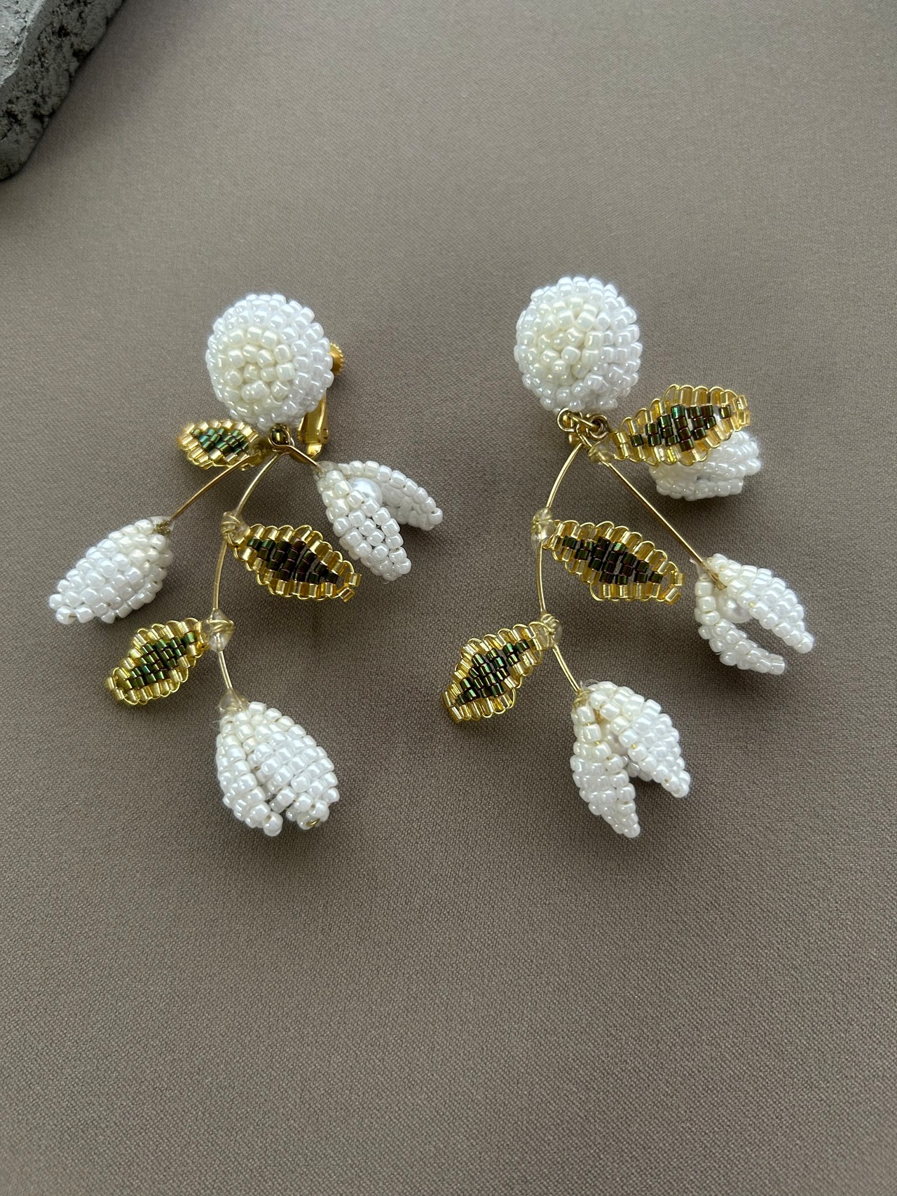 一粒一粒ビーズをワイヤーに通し、お花の形にあしらったフラワーイヤリング。