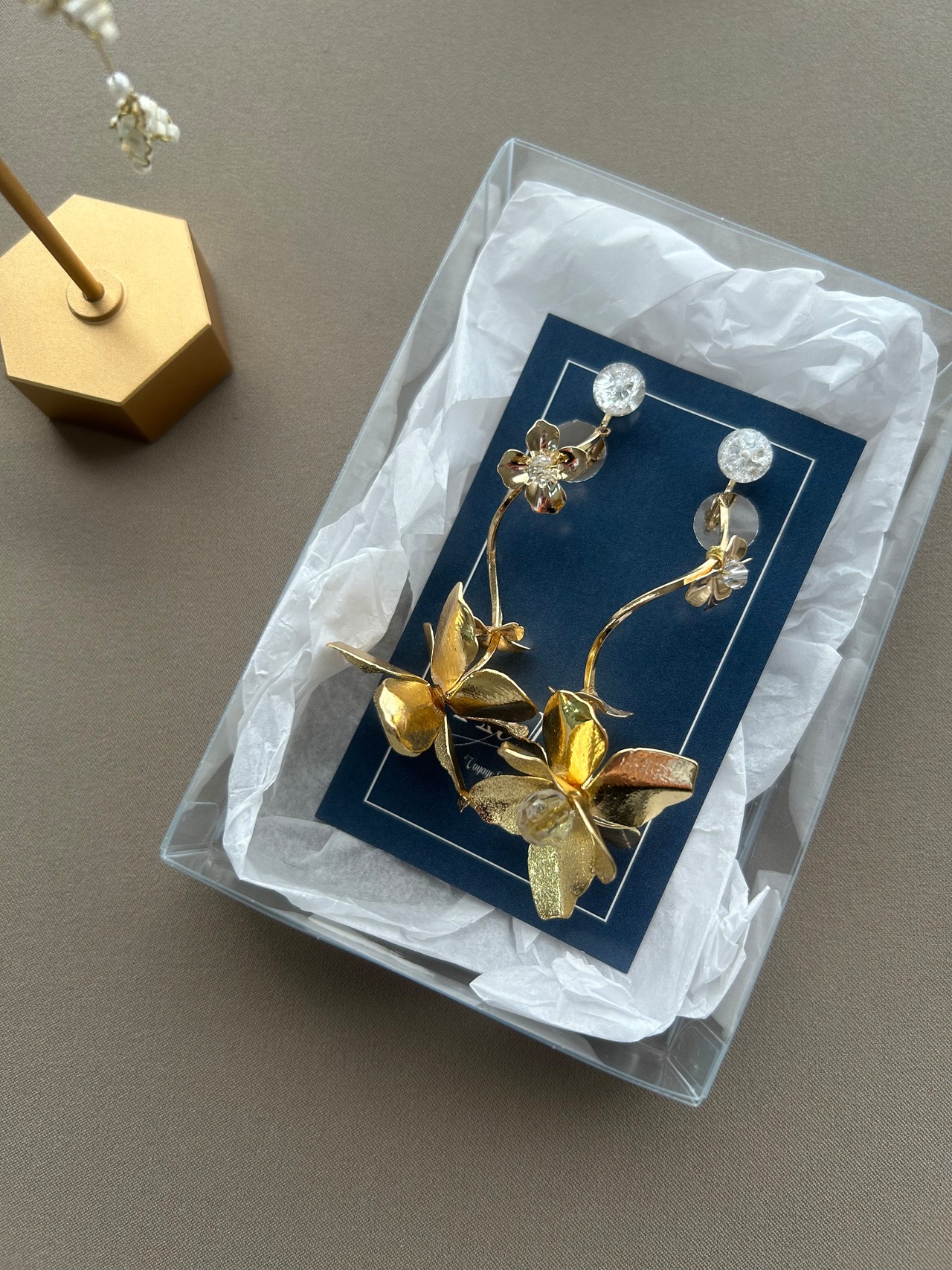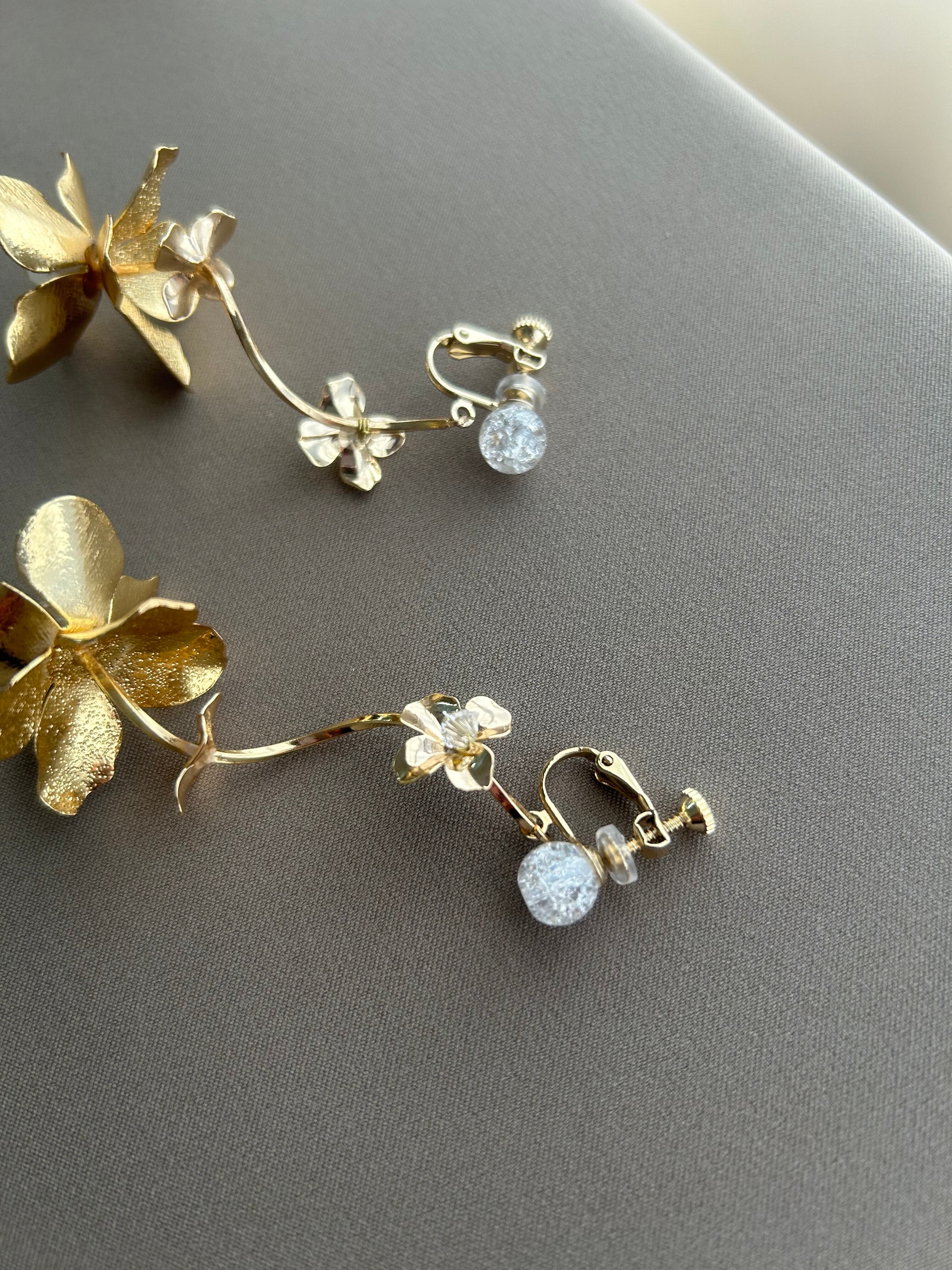 ゆるやかにウェーブしたメタルバーに大小のフラワーパーツを組み合わせてデザインしたナチュラルな印象のアクセサリー。