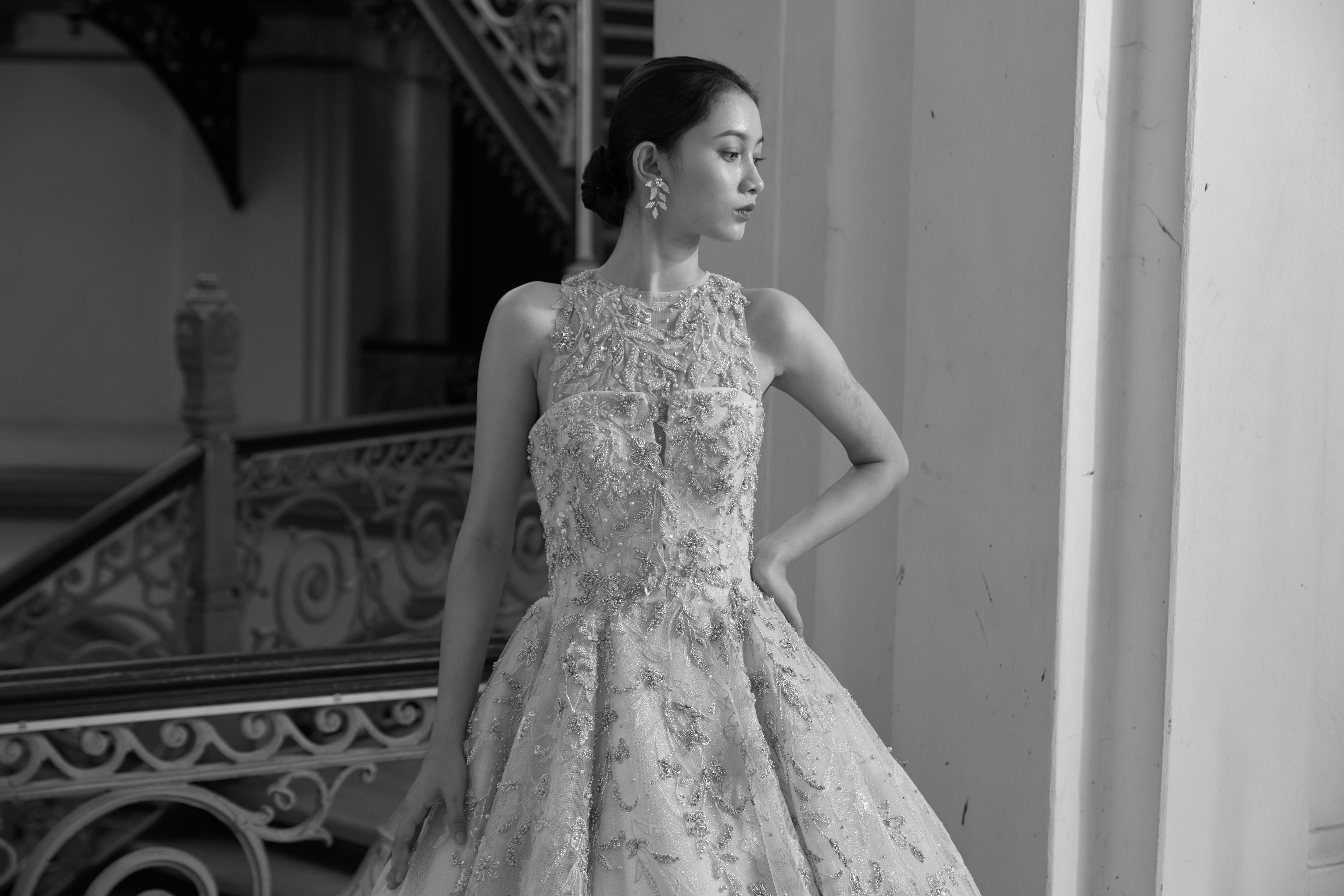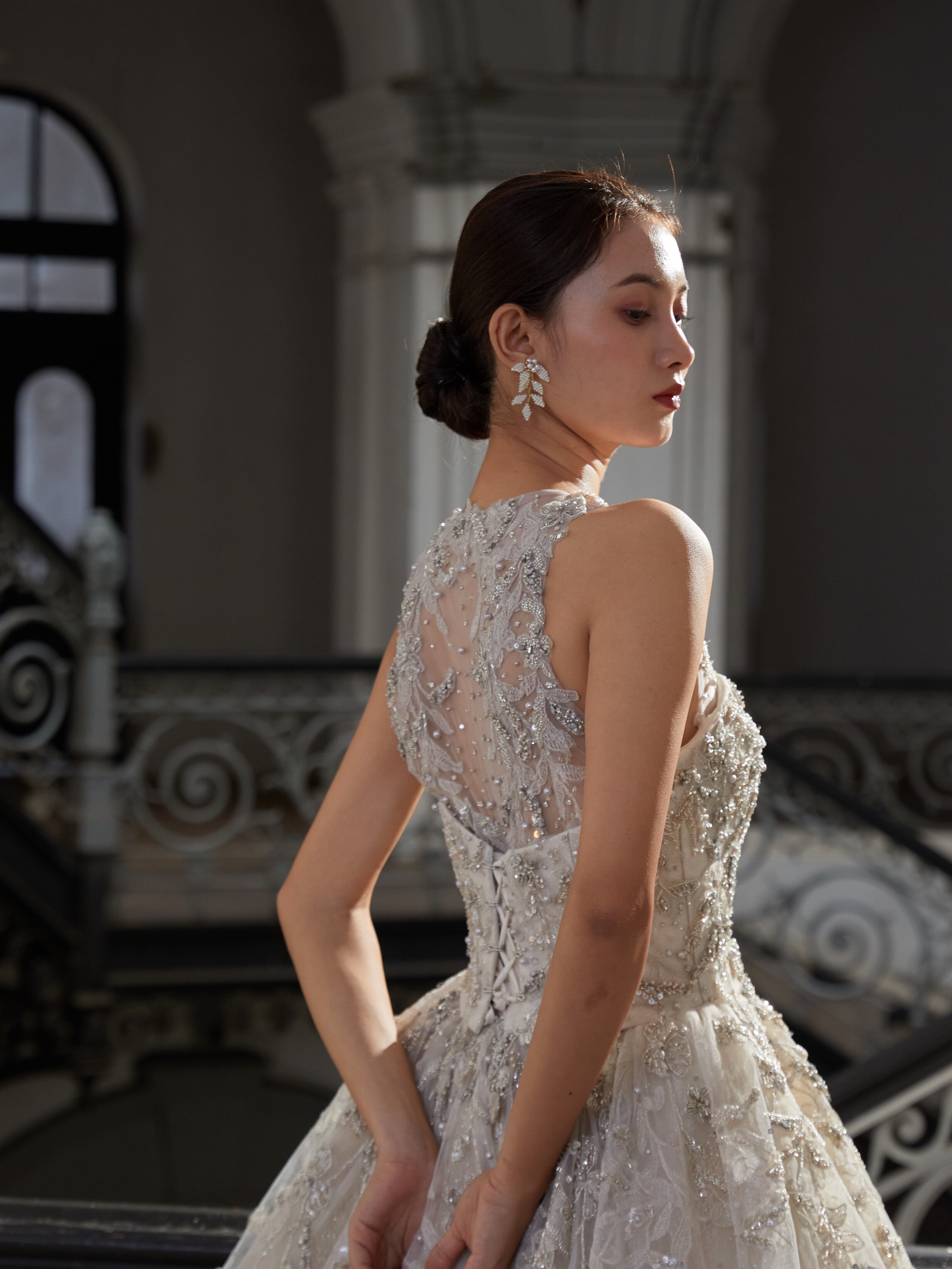 刺繍のたくさん入ったゴージャスなAラインドレスなどとのスタイリングがおすすめ。
